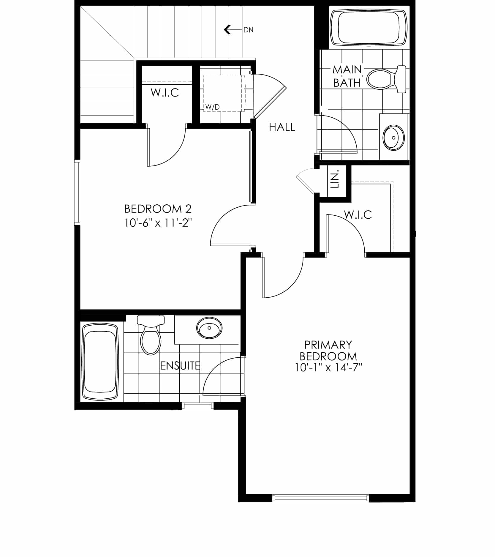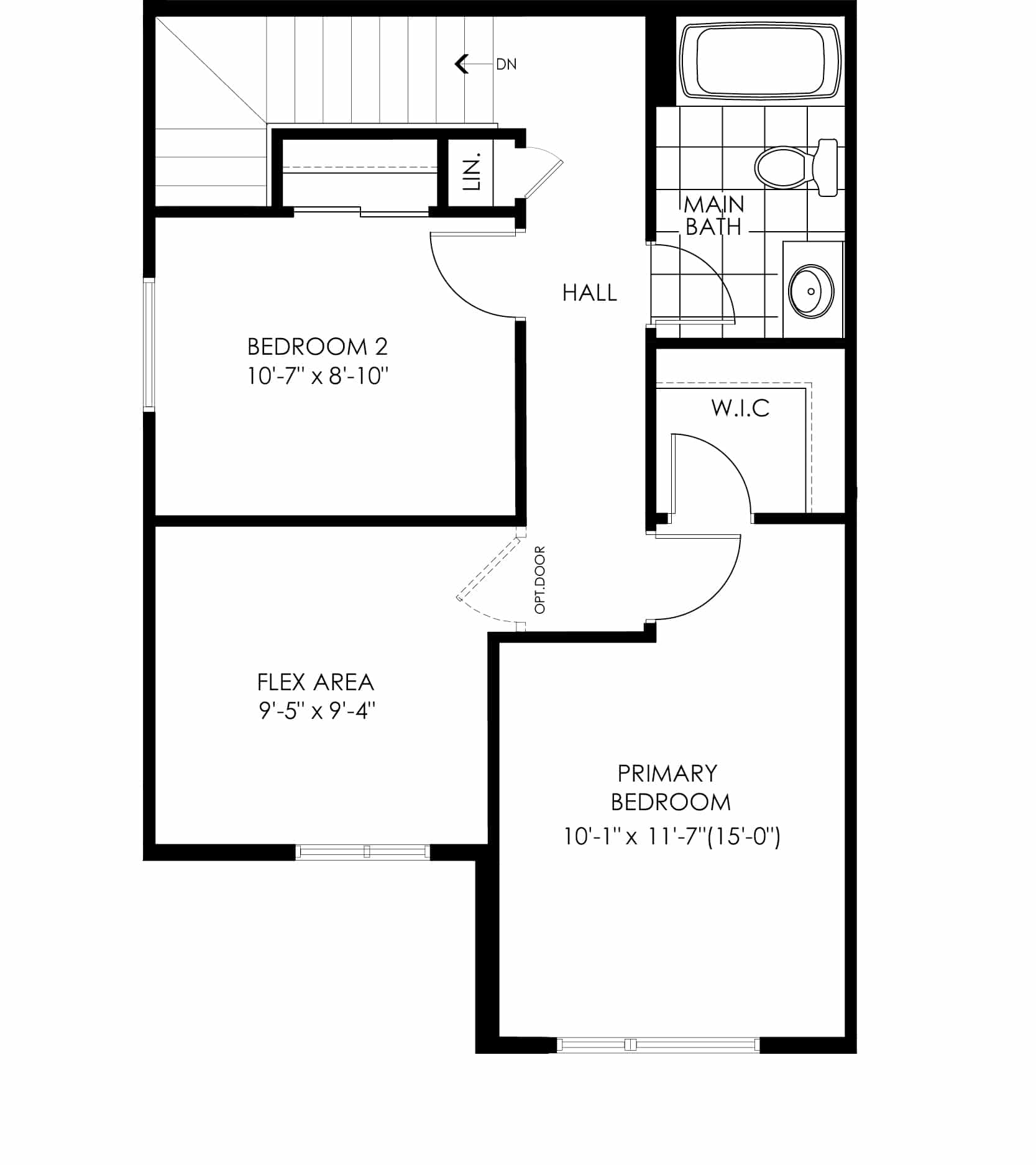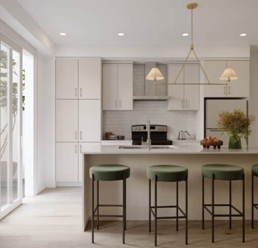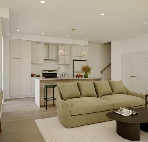 With windows on three sides, the Everett end unit offers even more light-filled living along with extra space. The ground floor features a covered porch, roomy foyer, and direct garage access. On the main floor, the kitchen—with a flush breakfast bar and pantry—connects seamlessly to the dining and living areas, while a powder room and balcony with glass sliding door extend the space outdoors. Upstairs, the primary bedroom with walk-in closet is paired with a second bedroom and a flexible bonus space—ideal for a home office, reading nook, or TV lounge—along with laundry and the main bathroom. Designer upgrade options include transforming the flex area into a private ensuite for the primary bedroom or enhancing the main bath to a deluxe layout.