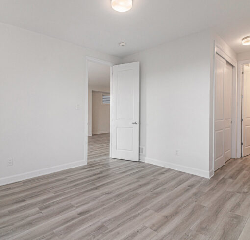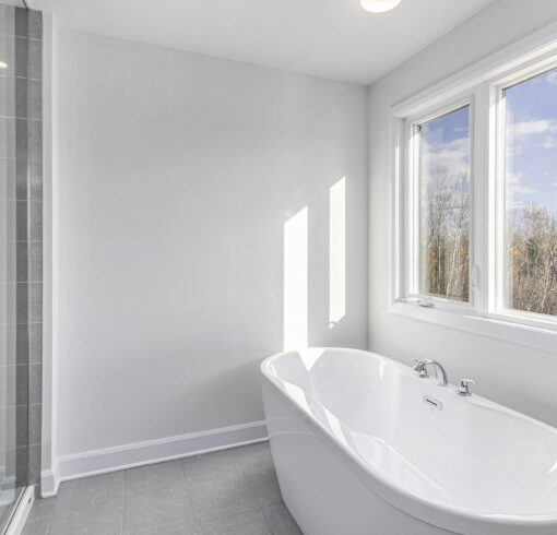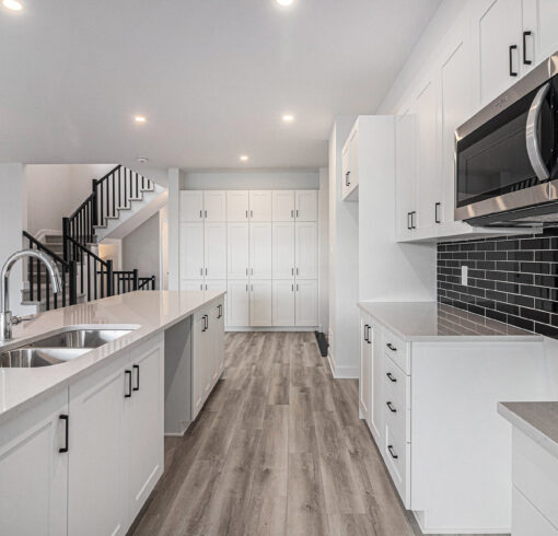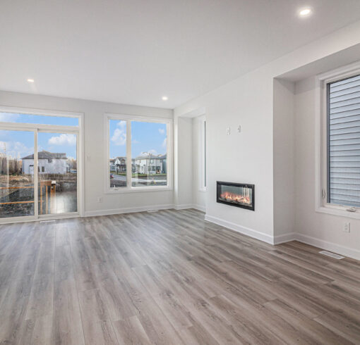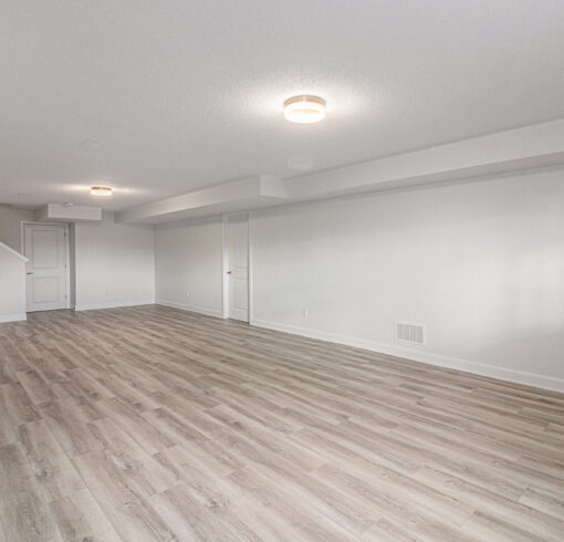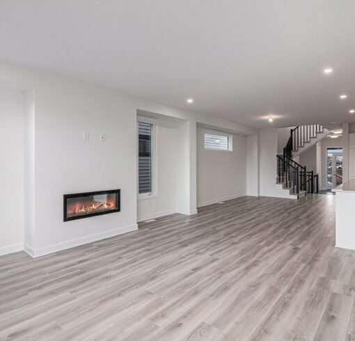 - Wood composite flooring throughout the main floor (excluding wet areas and guest suite), as well as in the upper hall and loft on the second floor, and the basement rec room.